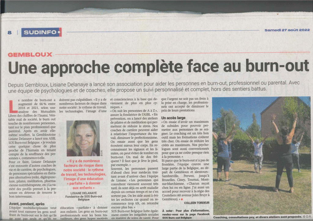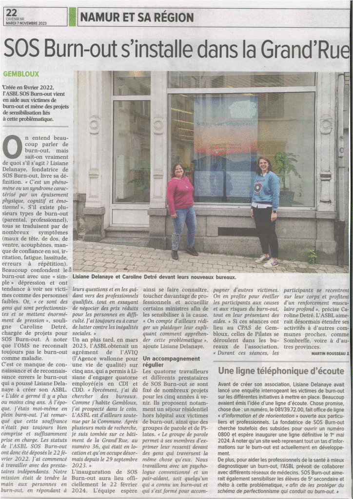 22-02-24CanalzoomL’ASBL SOS Burn-out beaucoup sollicitée depuis son ouvertureInauguration de l’ASBL et des locauxhttps://www.canalzoom.be/actu/lasbl-sos-burn-out-beaucoup-sollicitee-depuis-son-ouverture/15162