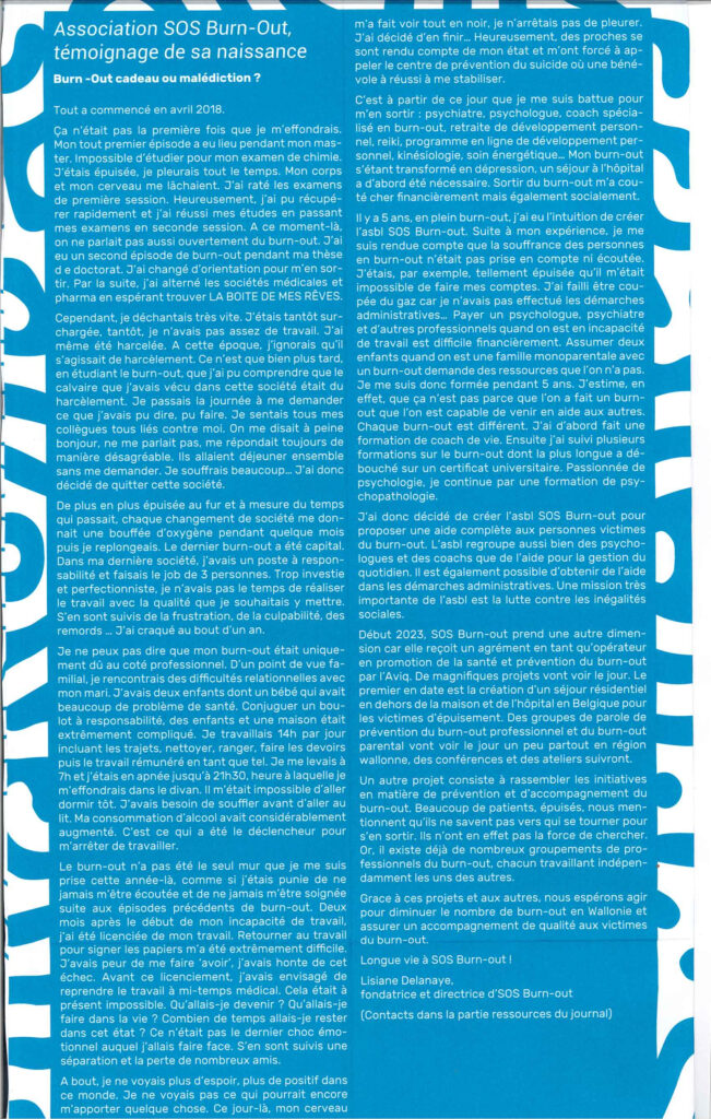 La Libre BelgiqueDossier média Planet «  Mind & Body » : « Lutter contre le burn-out par la prévention et la sensibilisation »interview Lisianehttps://fr.planet-health.be/mind-body/lutter-contre-le-burn-out-par-la-prevention-et-la-sensibilisation/