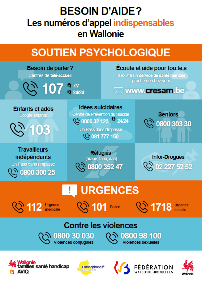 En cas d’idées suicidaires, vous pouvez appeler le Centre de Prévention du Suicide au 📞0800 32 123.